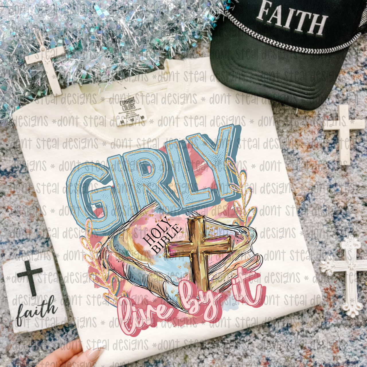 Soft, breezy, and quietly bold — this tee blends pastel nostalgia with heartfelt faith. A retro-inspired graphic reads “GIRLY” above an illustrated open Bible, a wooden cross, and soft floral accents, with the script “live by it” anchoring the design. The lightweight cotton drapes gently and breathes easily, so it moves with you from morning coffee to evening gatherings. Wear it layered under a denim jacket or alone on warm days; it carries a calm confidence that speaks to gentle strength and steady belief.